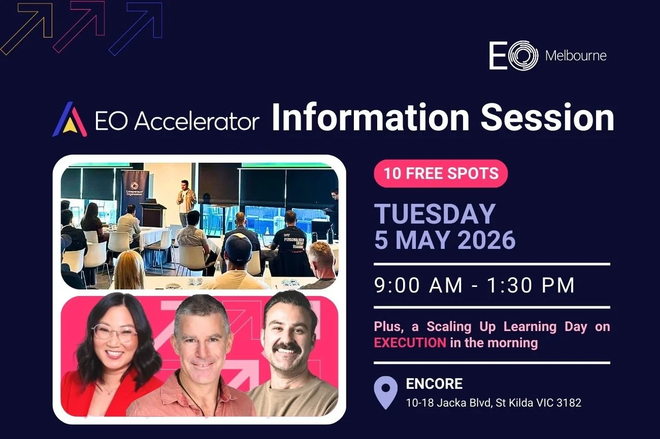 We will have a trainer for the Accelerator Learning Day-Execution, while EO Melbourne Accelerator Chair Ryan Spaccavento and EO Accelerator Kate Slater will facilitate the Information Session.