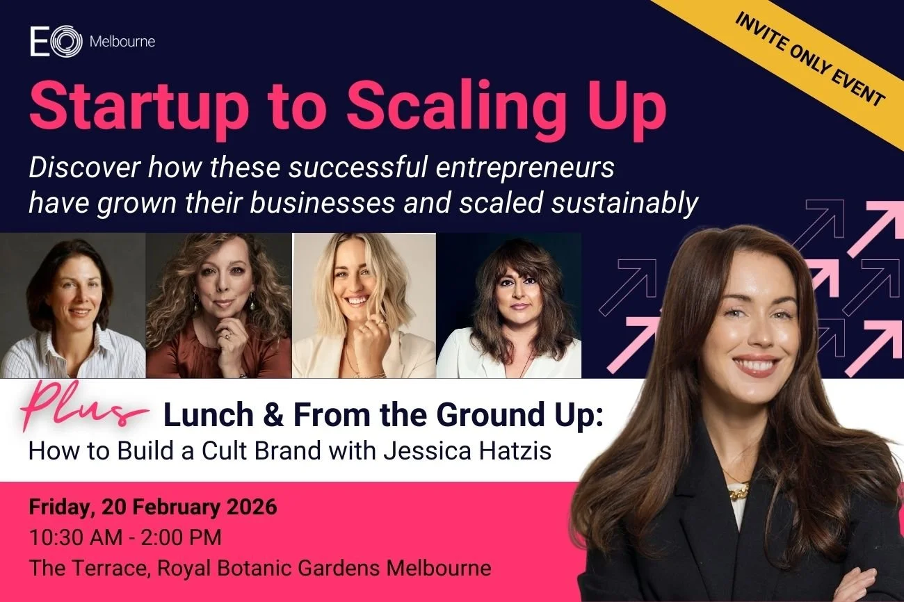 This VIP event offers a rare opportunity to experience it first-hand — opening with a talk, From the Ground Up: How to Build a Cult Brand with Jessica Hatzis, followed by powerful stories from trailblazing female entrepreneurs from EO Melbourne. The event includes a seated lunch.